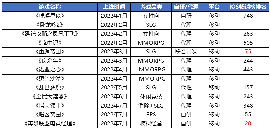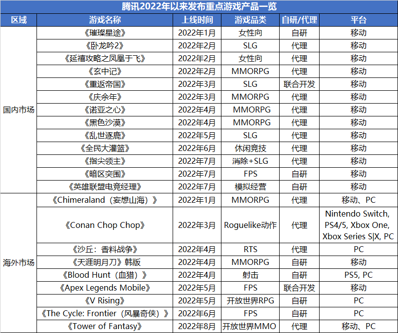 从产品数量来看,腾讯上半年推出的新游数量不减。据游戏财经汇不完全统计,22年以来,腾讯在国内上线了13款手游,其中自研产品4款,代理产品9款。