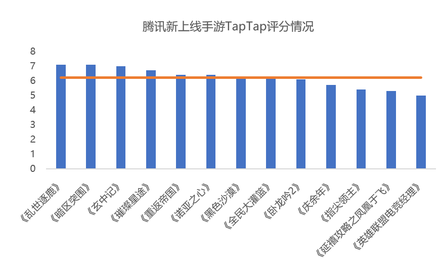 从评分来看,腾讯今年上线的手游总体评分中等偏下,满分10分的TapTap评分平均分6.2(上方横线)。