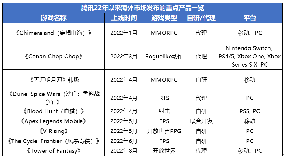 2022年至今,腾讯在海外市场共上线了9款游戏,游戏类型较为多元化,整体偏中重度。