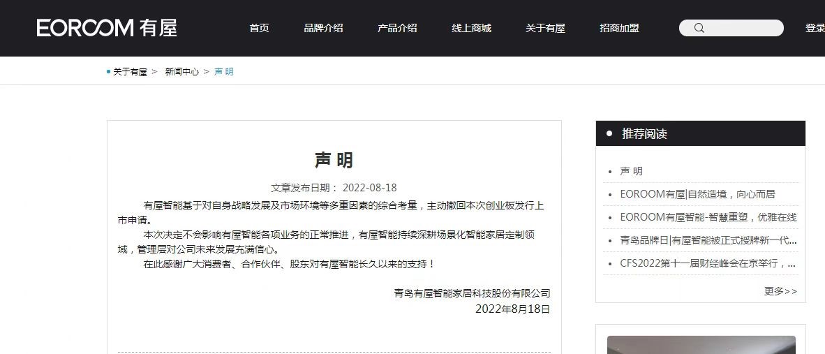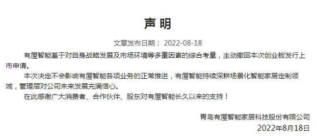 相关公告挂网后,有屋智能也于第一时间发布声明表示,“有屋智能基于对自身战略发展及市场环境等多重因素的综合考量,主动撤回本次创业板发行上市申请。本次决定不会影响有屋智能各项业务的正常推进,有屋智能持续深耕场景化智能家居定制领域,管理层对公司未来发展充满信心。”