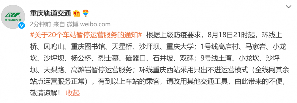 据上游新闻消息,8月18日,记者从重庆交通开投轨道集团获悉,根据上级防疫要求,8月18日即时起,环线上桥、凤鸣山、重庆图书馆、天星桥、沙坪坝、重庆大学;1号线高庙村、马家岩、小龙坎、沙坪坝、杨公桥、烈士墓、磁器口、石井坡、双碑;9号线土湾、小龙坎、沙坪坝、天梨路、高滩岩暂停运营服务;环线重庆西站采用只出不进运营模式(全线网其余站点运营服务正常)。有到以上车站的乘客,请改用其他交通工具,由此带来的不便,敬请谅解!