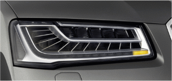 矩阵式LED大灯由5只反射单元排列成一个远光照明组件,在每一个反射单元的上面,是5颗小LED光源,每颗小LED光源可以独立点亮、关闭或者变暗,5组共25颗小LED光源配合在一起,就能实现对前方区域进行可变的、精确的照明。夜晚会车或者同向前方有车行驶时,矩阵式LED大灯会自动熄灭部分远光LED灯体,以防周边车辆驾驶员因炫目而发生危险。
