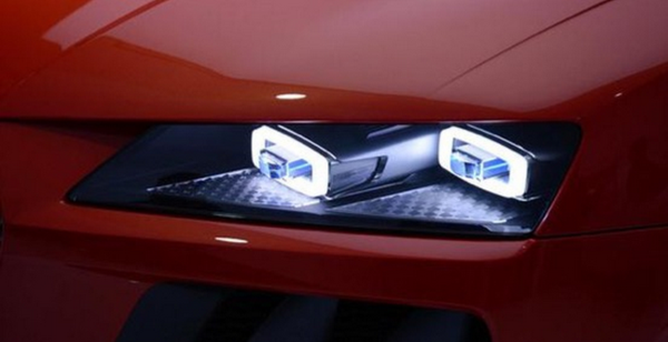 正当我们感慨灯厂实力之时,奥迪又默默进入了激光大灯时代。2014年,奥迪在CES展会上推出首款采用激光大灯的Sport quattro laserlight概念车。并随后推出了一辆采用激光大灯的R8 LMX。相比较于氙气和LED,激光大灯的亮度更高,可以通过一个镜片控制激光光束的方向,有指向性地照射到前方,距离也是LED远光灯的两倍。2015年CES展会上,奥迪推出prologue概念车,并展示了矩阵式激光大灯。