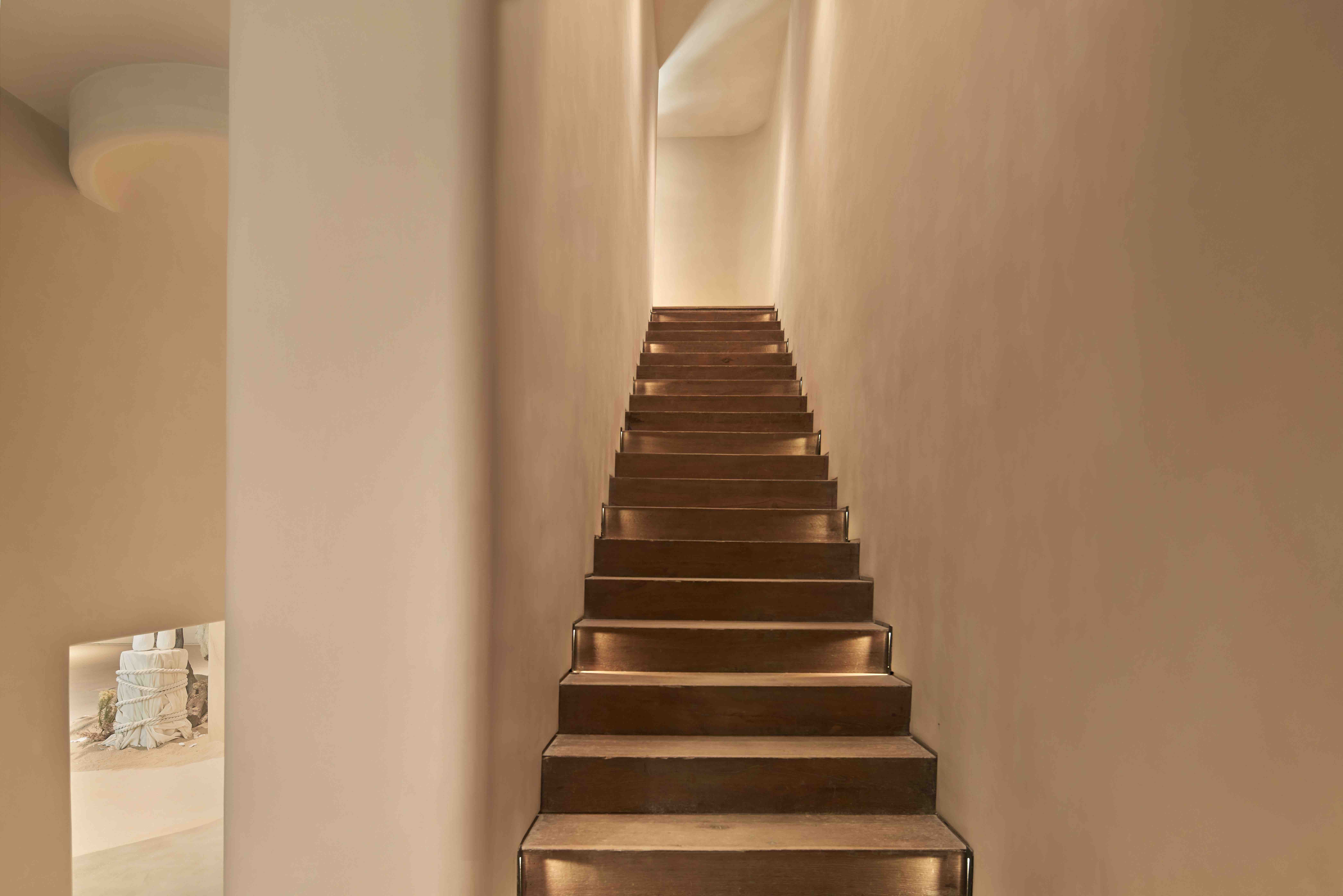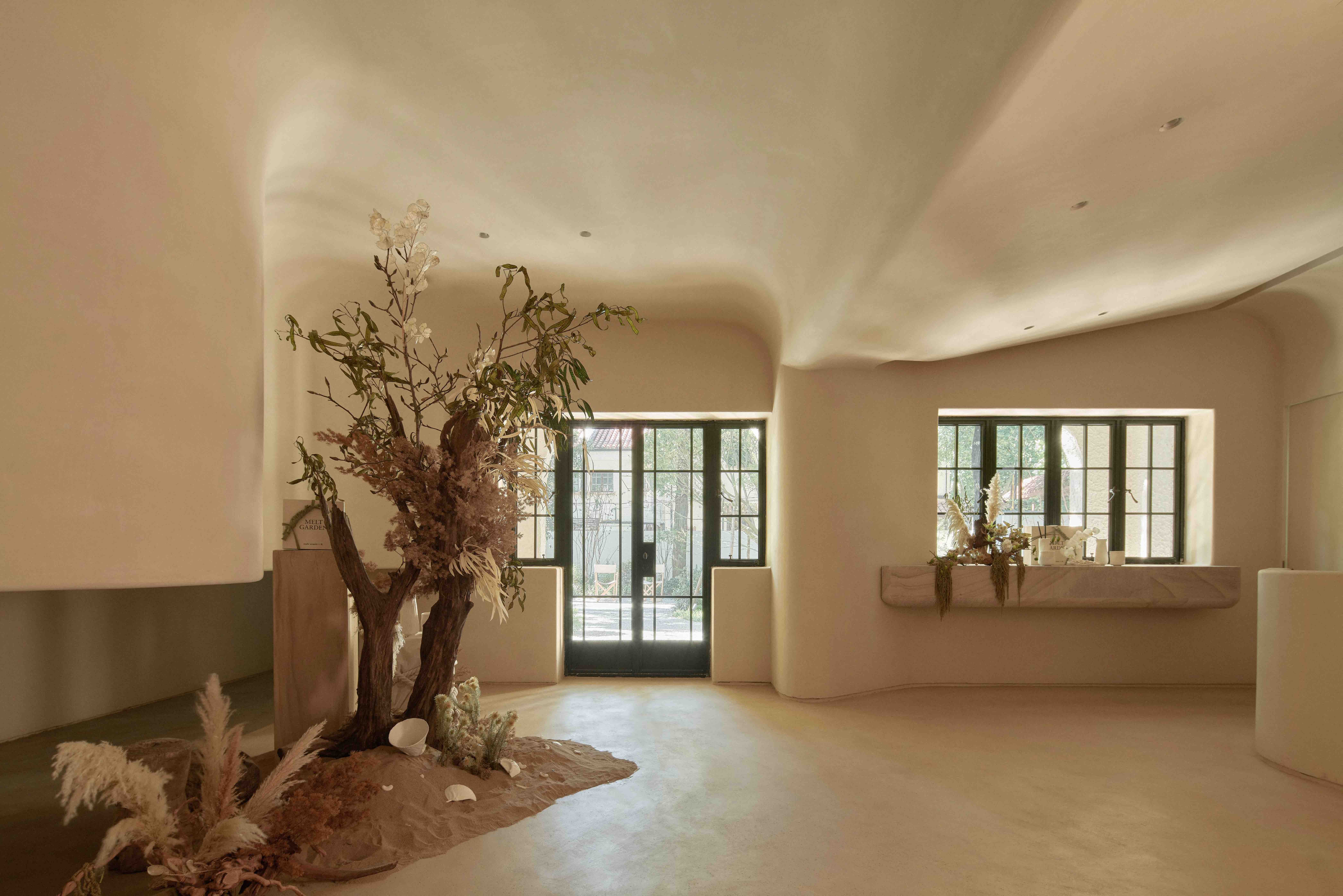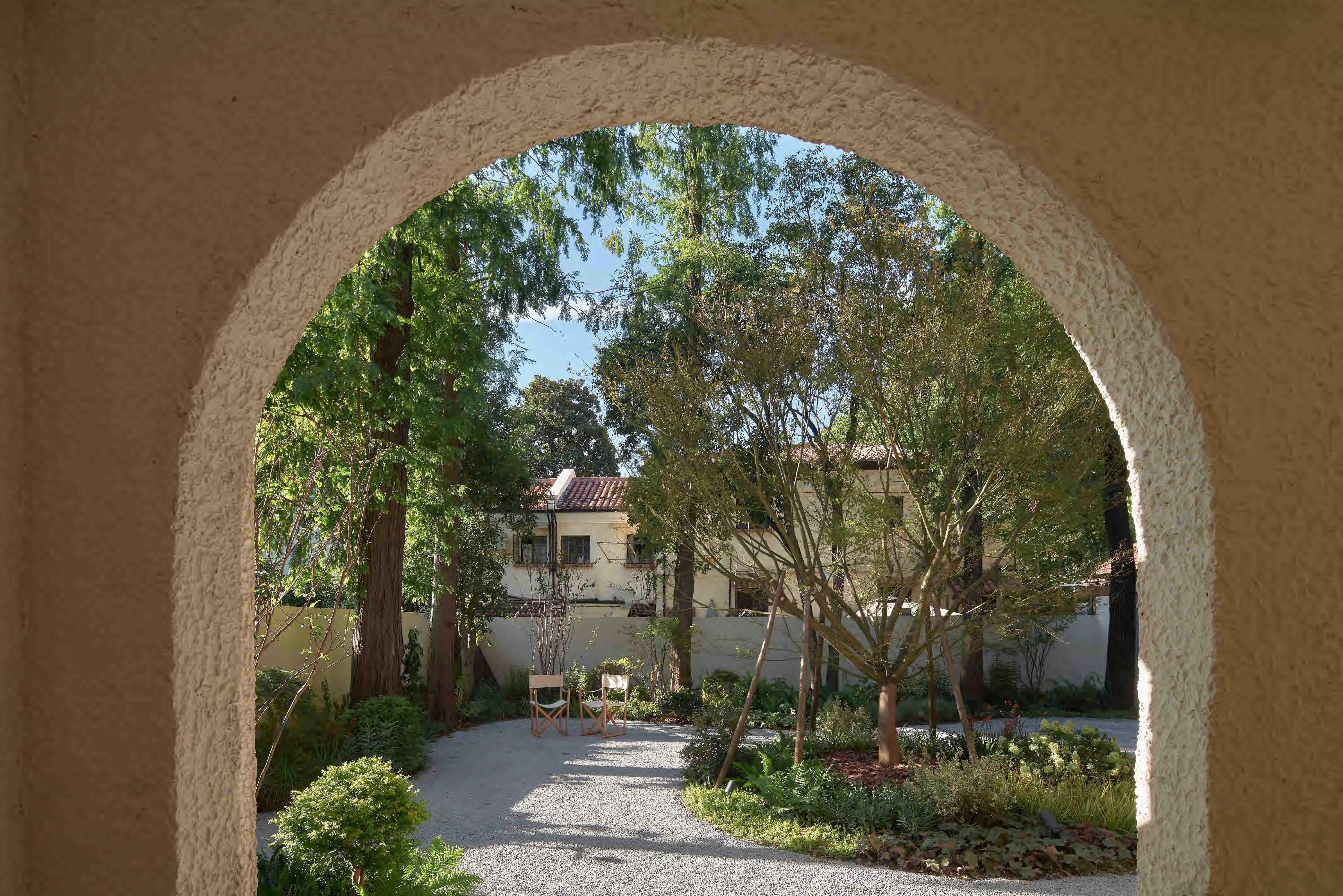 走进大门是一片郁郁葱葱的花园,空地处还闲适地摆放着两把坐椅。洋房内的一层主要是联名款的展示空间,天花板与墙壁相连,营造出一种如洞穴般的氛围。踩着木制楼梯走上二楼,大片落地窗引入外部明亮光线,楼下的园林景致也映入眼帘。