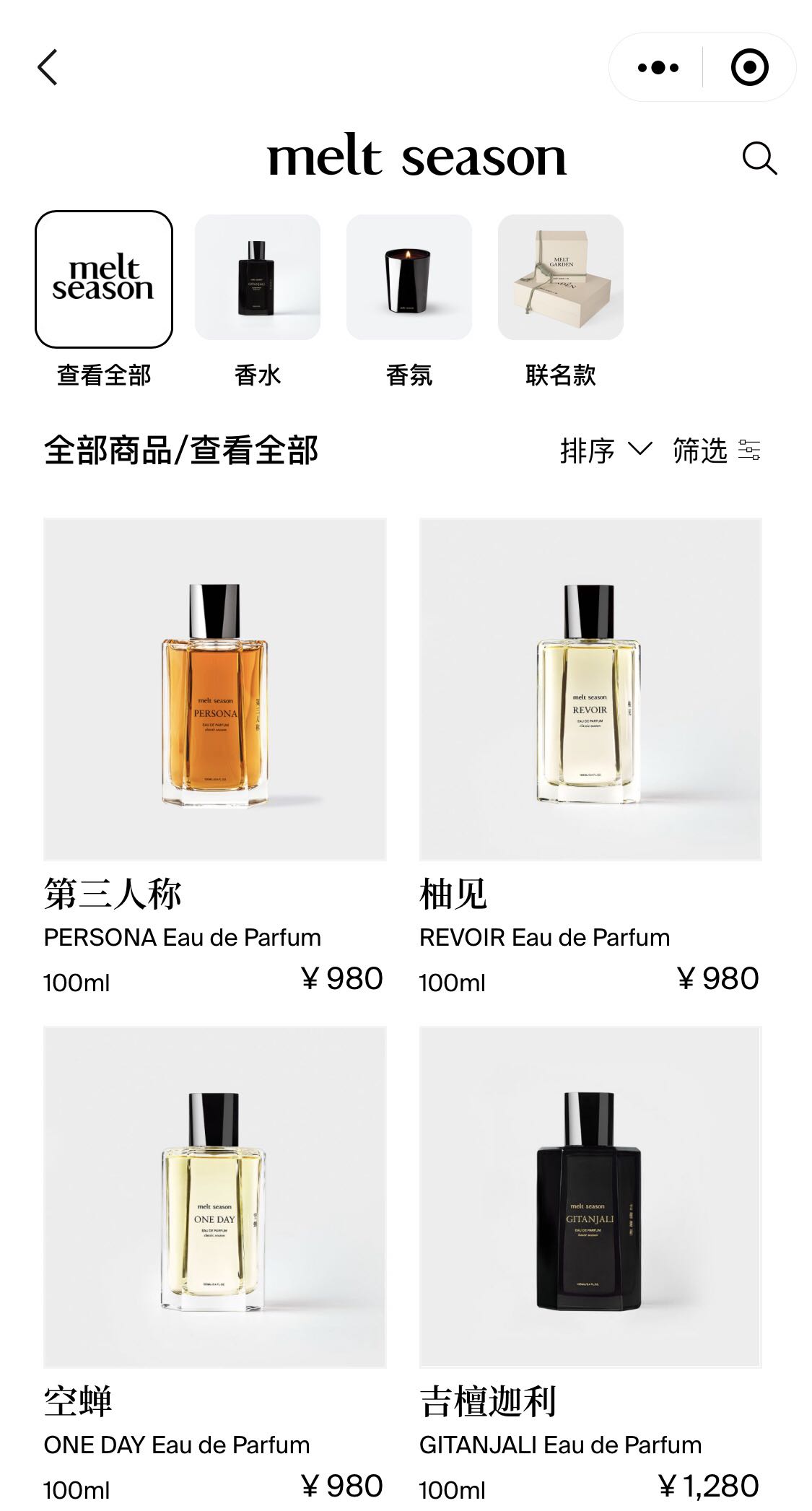 二层陈列着melt season迄今发布的所有香水及香氛产品。香水品类分为经典和高定两个系列。高定系列仅有100ml的大瓶装选择,售价1280元,且每月限量发售300瓶。经典系列有50ml及100ml两种选择,售价分别为680元和980元。