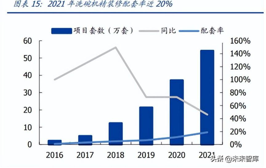 经过2016-2018年的爆发式增长后,洗碗机精装修市场仍然保持较快增长,2021年精装修市场洗碗机配套项目个数为742个,同比增长44.9%,配套规模为 54.16万套,同比提升46.1%,目前配套率已近20%。洗碗机在零售市场的高速发展促进消费者在购置新房时要求工程端配套洗碗机,而工程端的高配套率又会反过来促进零售端的发展,最终形成良性循环。