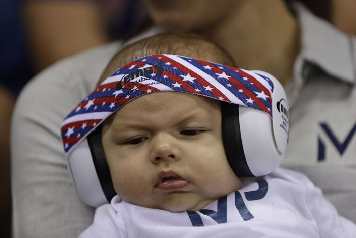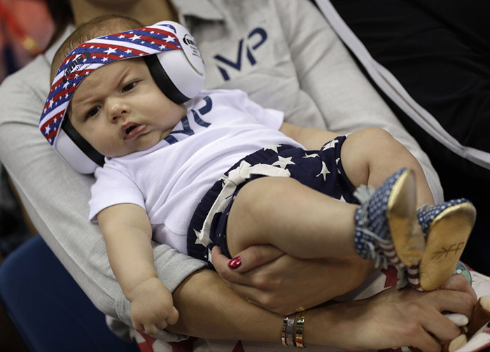 男子200m混合泳决赛中,美国游泳名将菲尔普斯再次夺冠,而他的儿子布默·罗伯特·菲尔普斯和他头上可爱的婴儿防噪音耳机一起,又一次成为了全场焦点。
