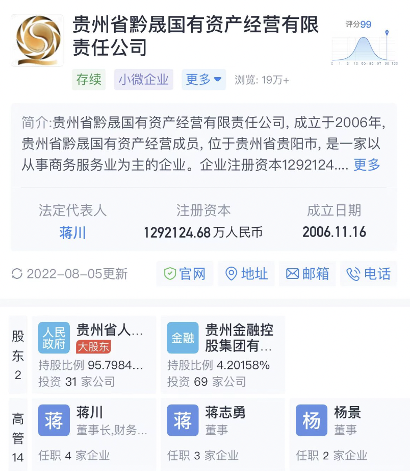 值得注意的是,根据天眼查APP显示,黔晟国资的大股东为,贵州省人民政府国有资产监督管理委员会,持股比例高达96.8%。