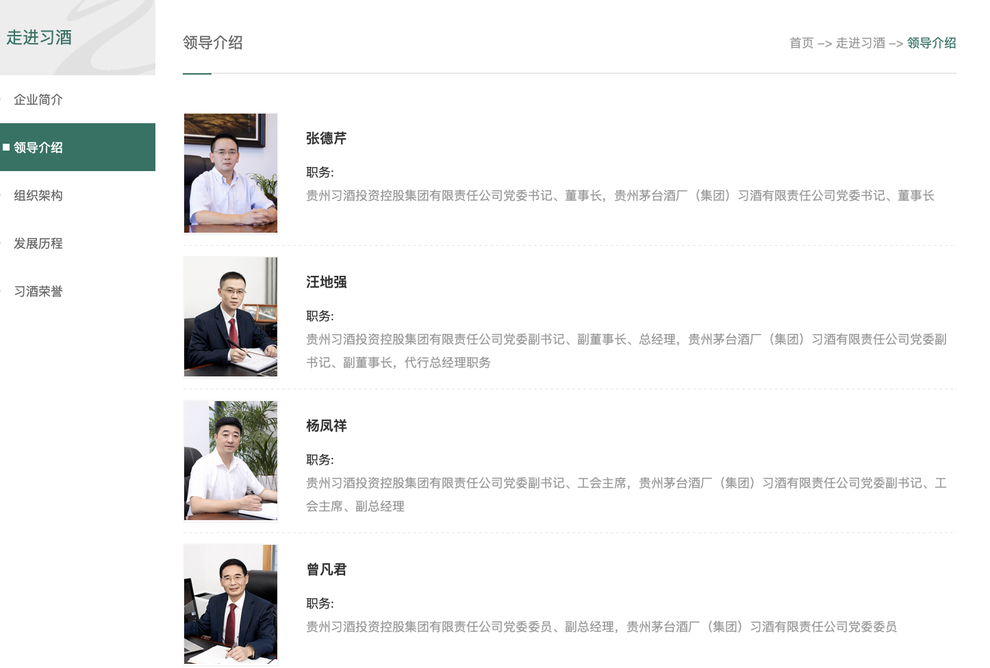 8月23日,界面新闻登录习酒公司官方发现,目前贵州习酒投资控股集团有限责任公司(以下简称“习酒集团”)和习酒公司的高管团队名单正式公布,共计13人。其中,张德芹任习酒集团与习酒公司党委书记、董事长,汪地强任习酒集团党委副书记、副董事长、总经理。