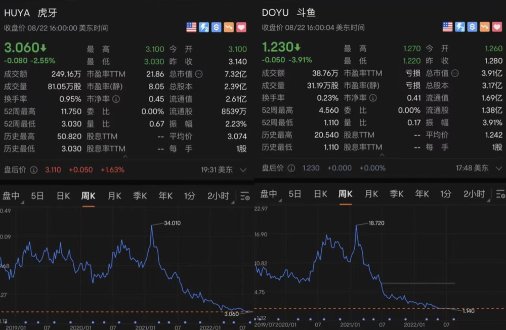 反映到市值上,在宏观和行业政策压力下,二者的市值持续下跌。斗鱼的总市值仅剩4亿美元左右,虎牙市值则不足8亿美元,对应的PS市销率均不足0.5倍。