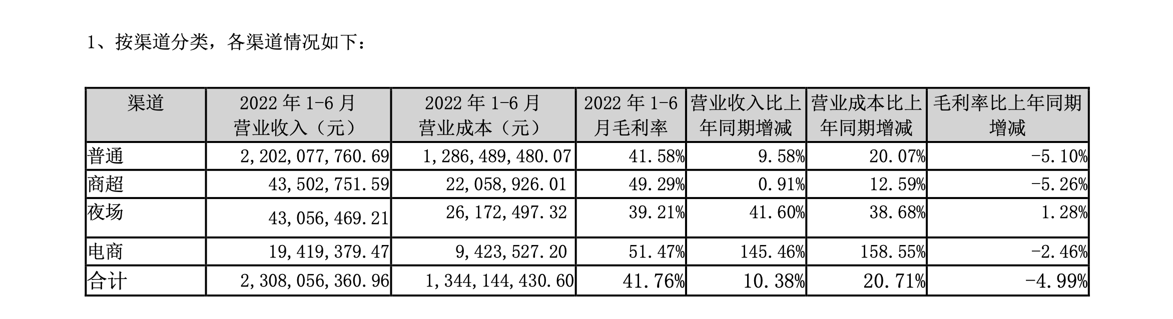 从渠道层面来看,上半年珠江啤酒主要以普通渠道为主。根据公告显示,普通渠道、商超渠道、夜场渠道以及电商渠道分别实现营收22.02亿元、0.44亿元、0.43亿元、0.19亿元,同比提升9.58%、0.91%、41.6%以及145.46%。