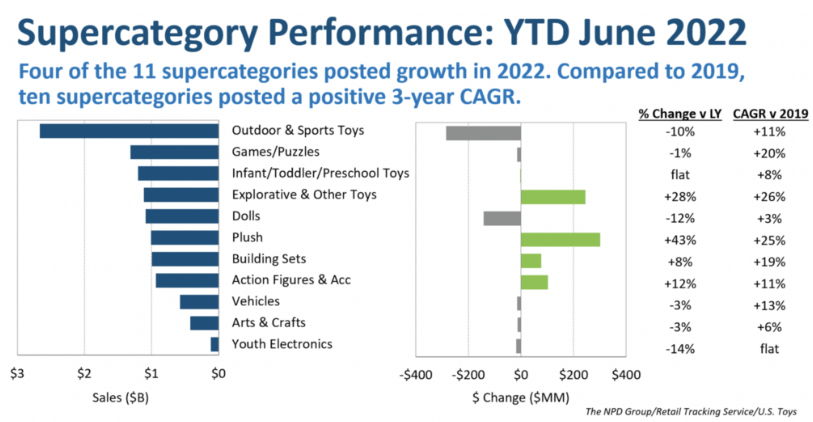 在玩具市场的细分品类中,毛绒玩具受Squishmallows等产品带动,销售增长43%;表现第二优异的是探索和其他玩具,在蓬勃发展的交易卡业务带动下增长28%(与疫情前的2019年相比)。