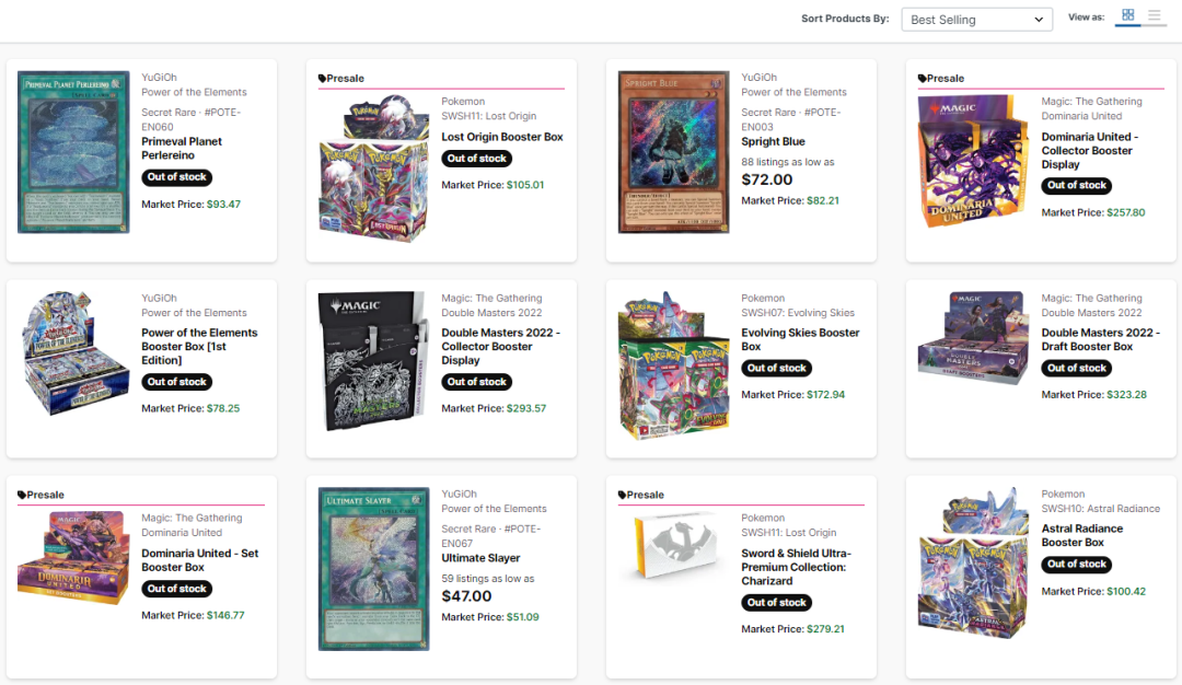 TCGplayer上有《游戏王》《万智牌》《宝可梦》《数码宝贝》《血肉之战》《卡片战斗》《龙珠超》等卡牌,除了提供交易平台,它也为卖家提供存储、物流等工具和服务。