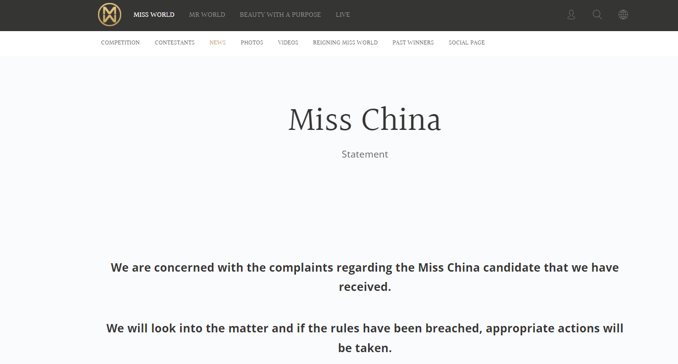 值得一提的是,世界小姐官网8月24日发布声明,对收到的有关世界小姐中国区候选人的投诉表示关注,并将调查此事,如果违反规定,将采取适当行动。