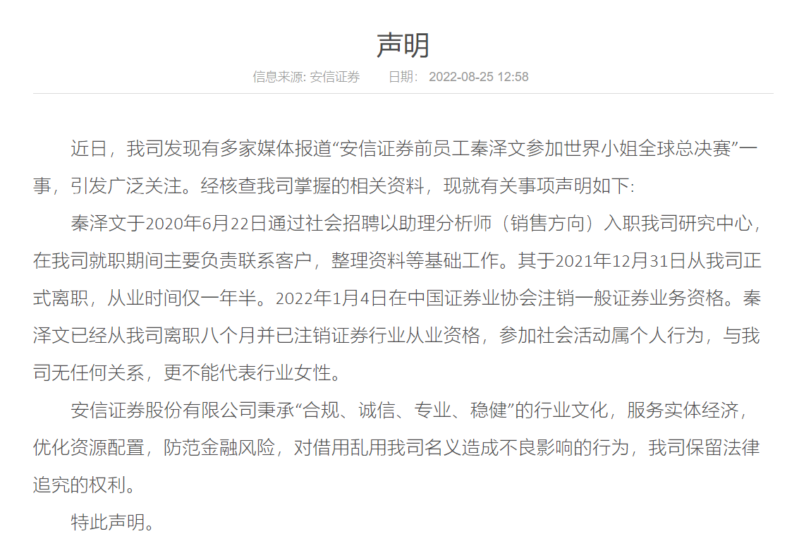 安信证券指出,2022年1月4日在中国证券业协会注销一般证券业务资格。秦泽文已经从公司离职八个月并已注销证券行业从业资格,参加社会活动属个人行为,与安信证券无任何关系,更不能代表行业女性。