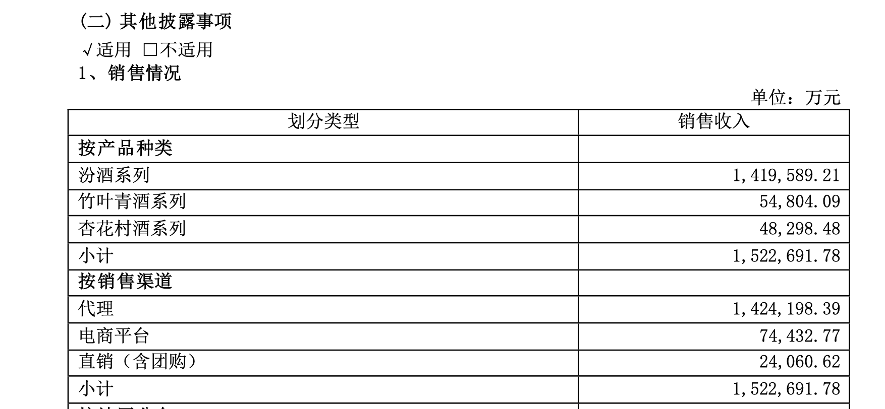 此外,从销售渠道来看,山西汾酒代理渠道、电商渠道以及直销(含团购)渠道分别实现销售收入142.42亿元、7.44亿元、2.41亿元。值得注意的是,尽管山西汾酒上半年以代理渠道为主,但电商渠道也取得了快速增长。据悉,京东汾酒官方旗舰店累计销售排名行业第一。