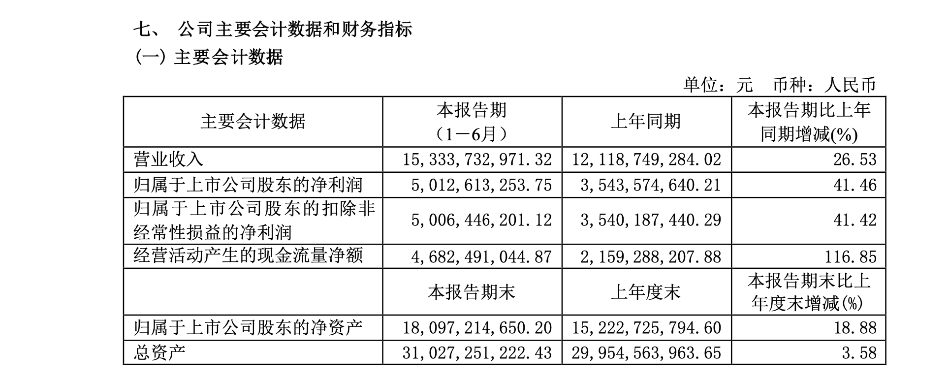 8月25日,山西杏花村汾酒厂股份有限公司(以下简称“山西汾酒”)(600809)发布《2022年半年度报告》显示,今年上半年公司实现营业收入153.34亿元,同比提升26.53%;归属于上市公司股东的净利润为50.13亿元,同比提升41.46%;经营活动产生的现金流量净额为46.82亿元,同比提升116.85%。