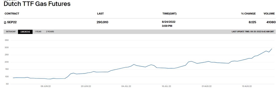 仅在8月,欧洲天然气期货价格就上涨了近40%。当地时间8月24日,荷兰TTF天然气9月合约价格收于290.9欧元/兆瓦时,依然处于历史高位。去年8月24日,荷兰TTF天然气期货仅为27.6欧元/兆瓦时。