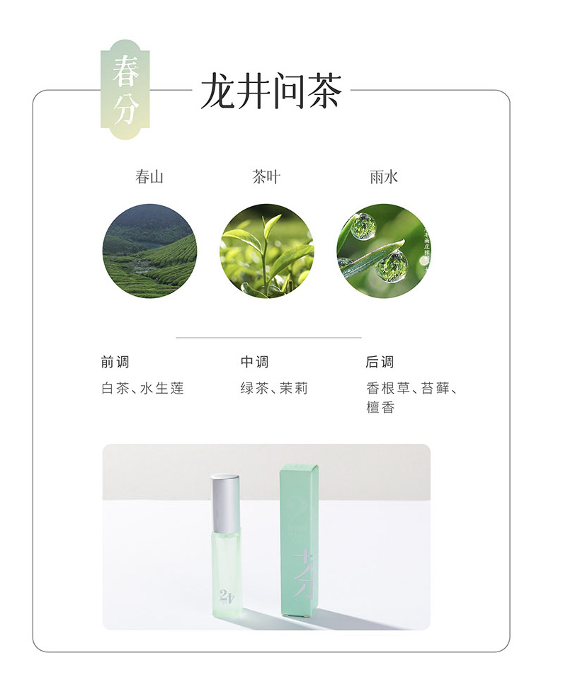 从实际的产品及宣传来看,节气盒子在产品名及香味描述上运用了很多古典文化元素。比如,其四季流心香水有“龙井问茶”、“苔痕阶绿”、“帘卷柳烟”、“游园梦胭”等十二种香型,分别对应十二种节气。以“龙井问茶”为例,其前中后调的描述为春山、茶叶和雨水。