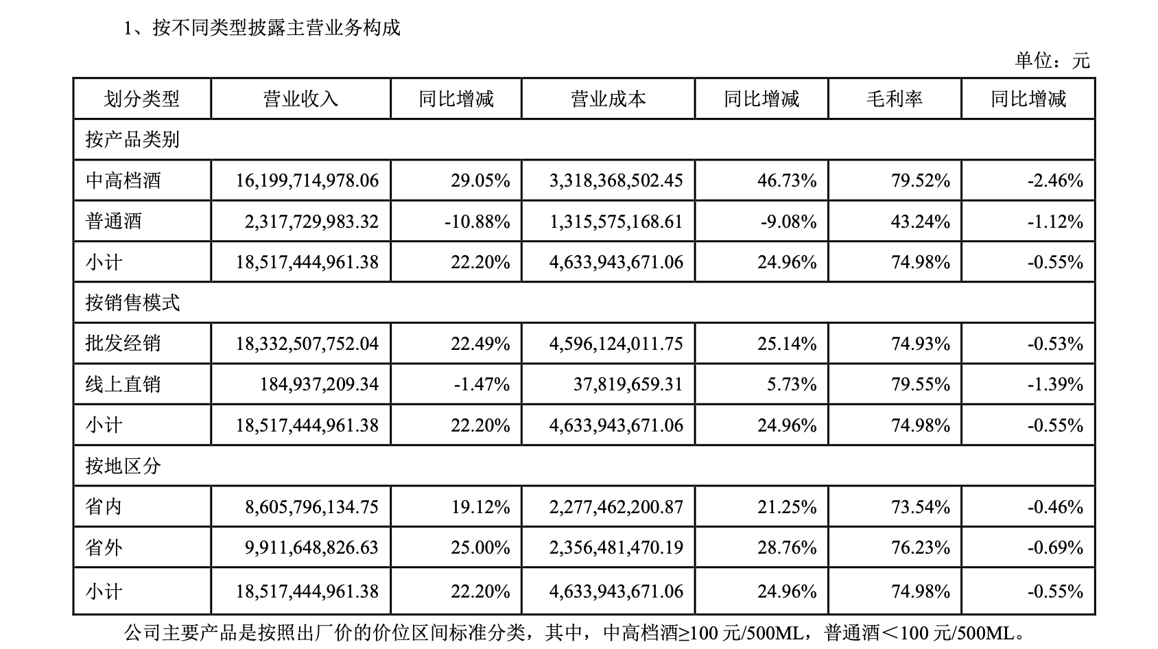 此外,今年上半年洋河股份省内市场、省外市场营收均呈现双位数提升。根据公告显示,洋河股份上半年省内市场、省外市场分别实现营业收入86.06亿元、99.12亿元,同比提升19.12%、25%。