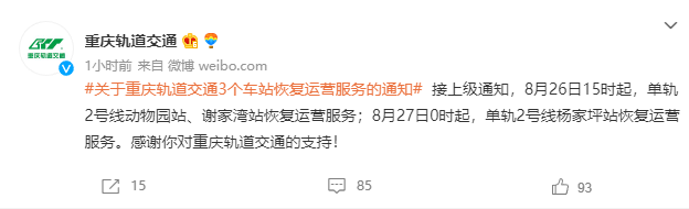 据重庆轨道交通微博消息,接上级通知,8月26日15时起,单轨2号线动物园站、谢家湾站恢复运营服务;8月27日0时起,单轨2号线杨家坪站恢复运营服务。