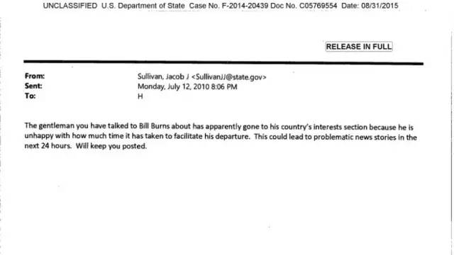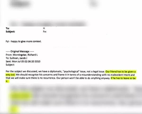 第一封日期为2010年7月5日,高级助理杰克·苏利文转发原国务院欧亚能源事务特别代表理查德·莫宁斯塔的邮件:“应给我们的朋友一条出路,意识到他的担忧,并保证下不为例……如果他一定要走,那就随他去吧。”