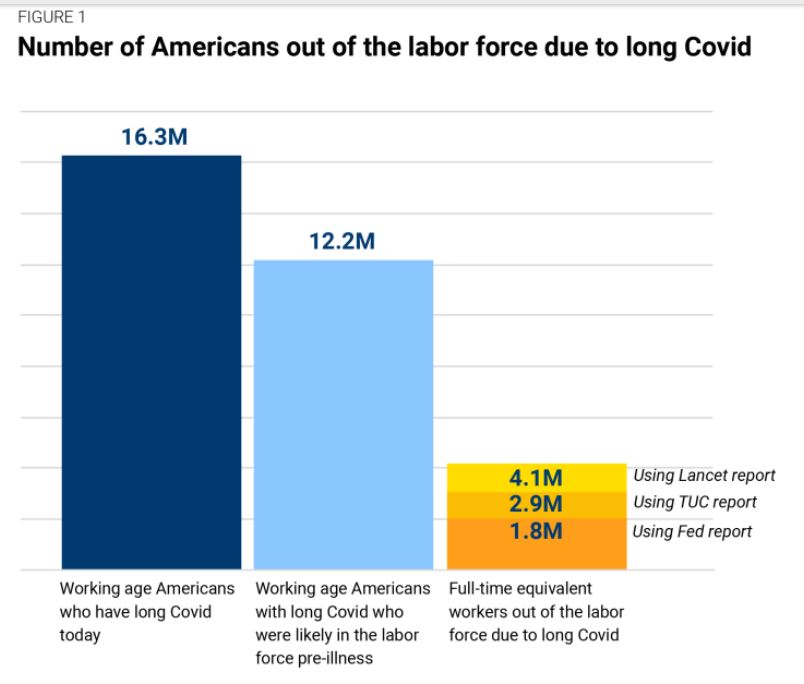 报告根据明尼阿波利斯联邦储备银行、英国工会联盟和《柳叶刀》的研究估算,在出现新冠长期症状的美国人中,有200万到400万全职员工因长期症状而失业。300万占美国平民劳动力的1.8%。