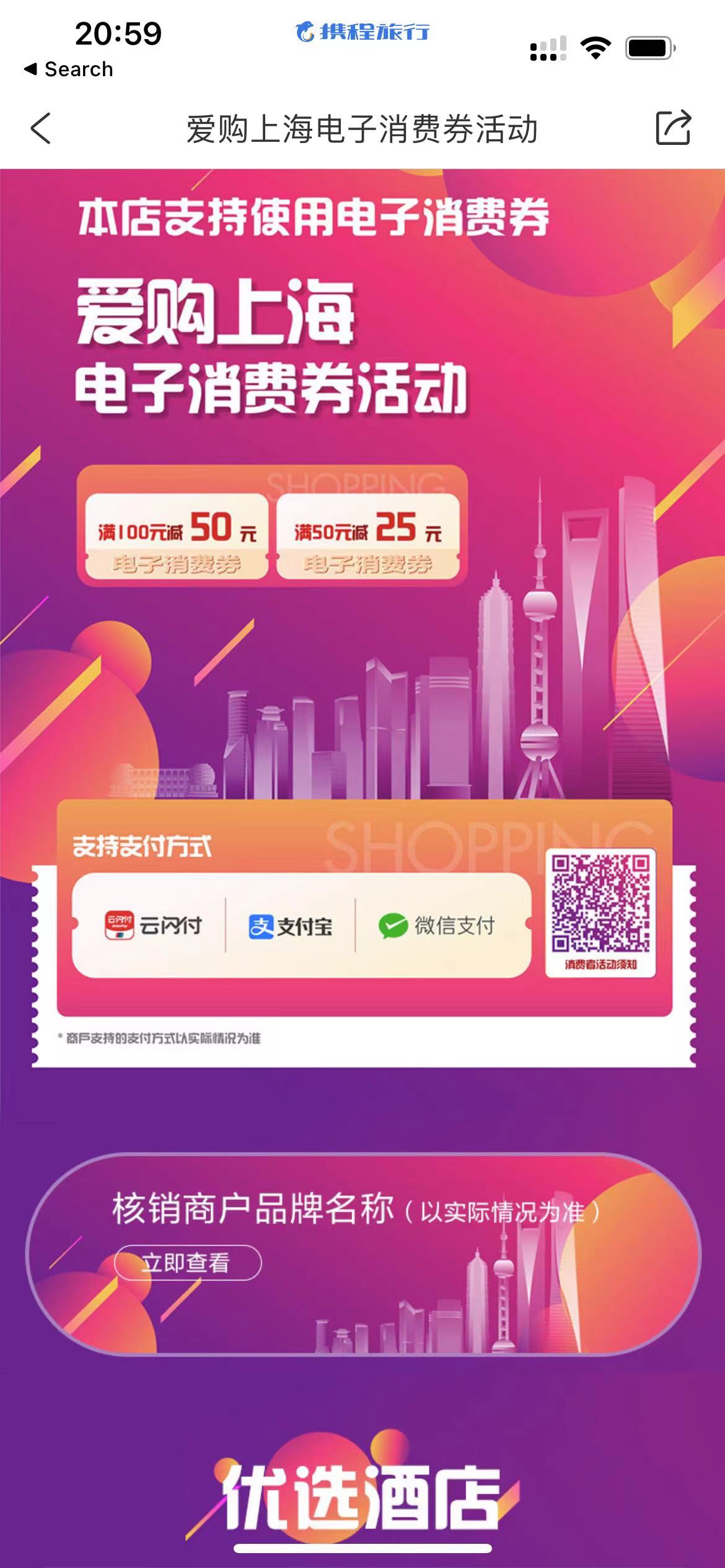 在携程平台上,共有逾5400家上海地区酒店、逾百家本地景区参与本次活动。此外,为进一步放大政策优惠效应,携程打通内部支付系统,市民在携程预订酒店、门票产品时,可以将“爱购上海”电子消费券与携程平台优惠券叠加使用,最大程度惠及消费用户。