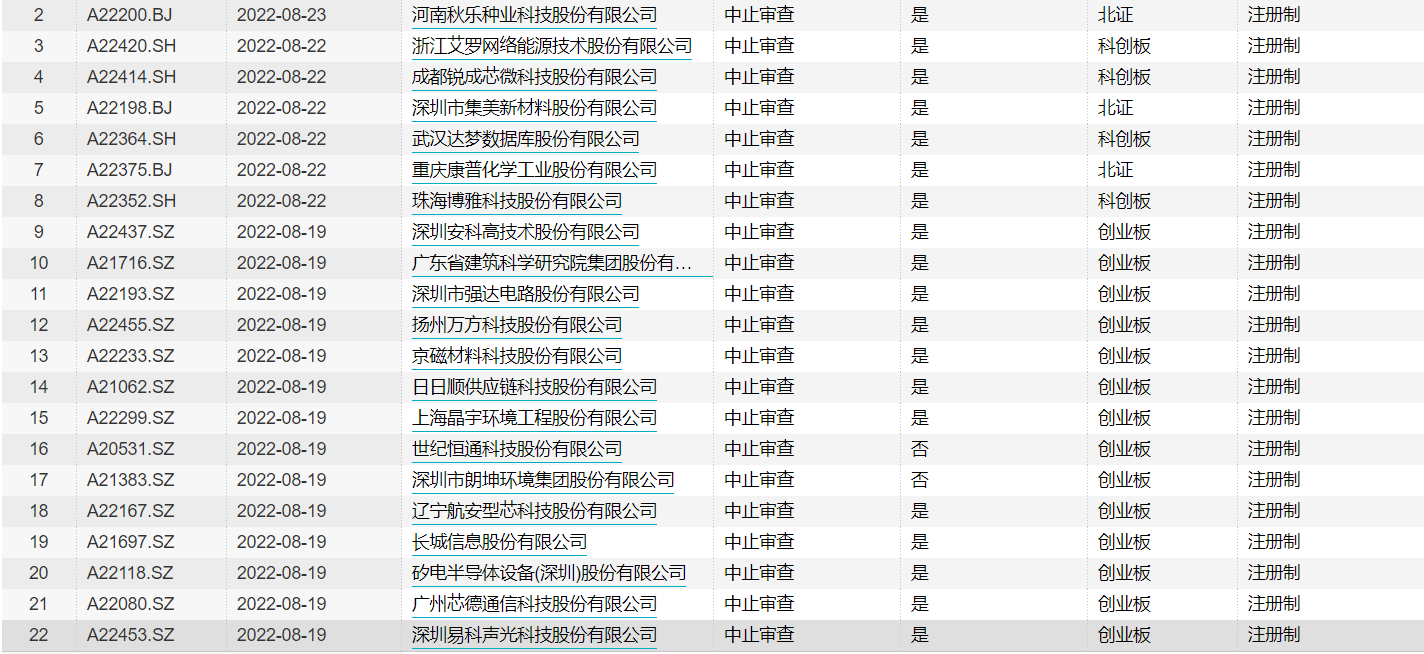 Wind数据显示,自8月19日以来,共有21家公司被中止审查,其中以创业板居多。此前证监会对首次公开发行股票申请审核过程中有关中止审查等事项的要求进行详细阐述。其中一条即是发行人的保荐机构、律师事务所等中介机构因首发、再融资、并购重组业务涉嫌违法违规,或其他业务涉嫌违法违规且对市场有重大影响被中国证监会立案调查,或者被司法机关侦查,尚未结案。