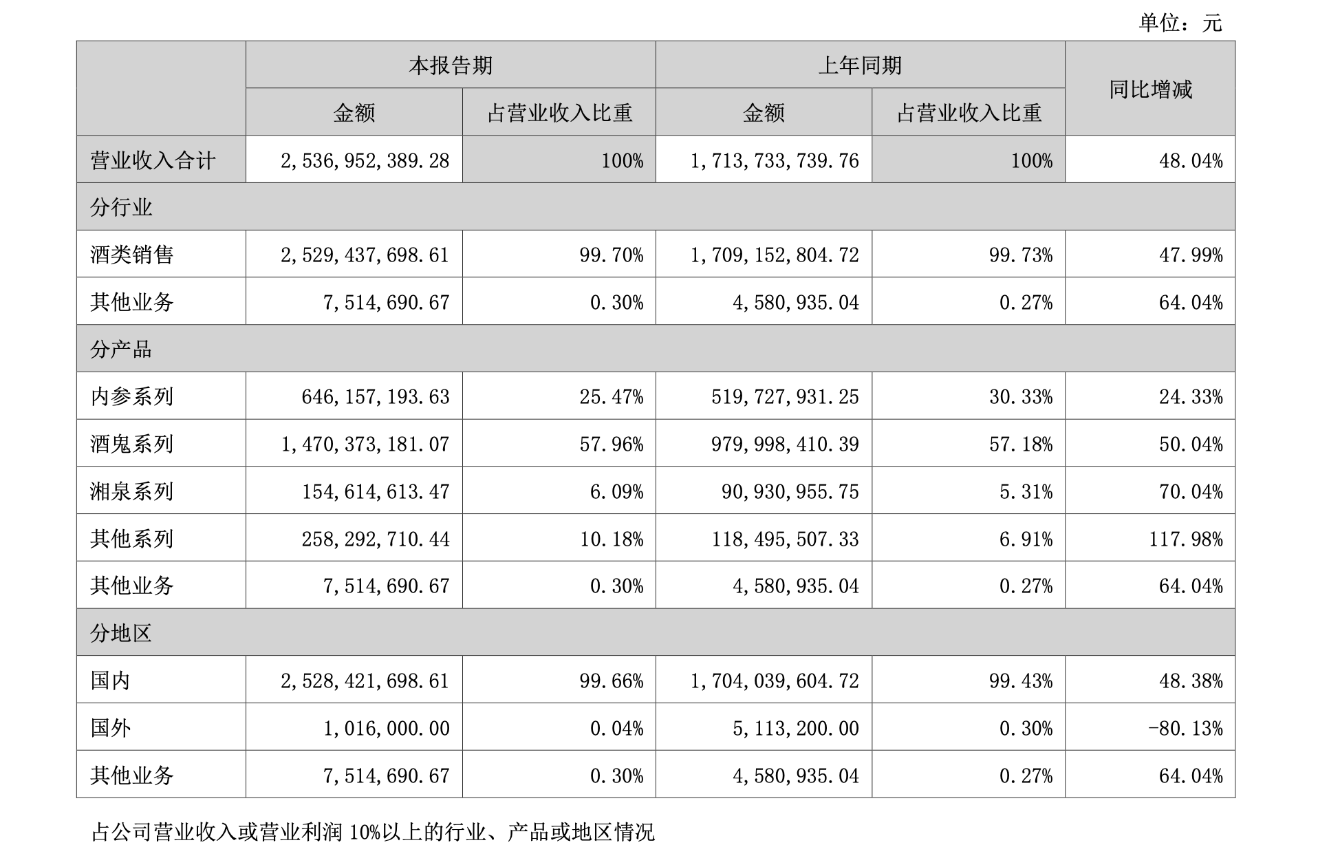 对于业绩提升,酒鬼酒在公告中指出,主要系本期酒鬼系列、内参系列、其他系列收入增长所致。