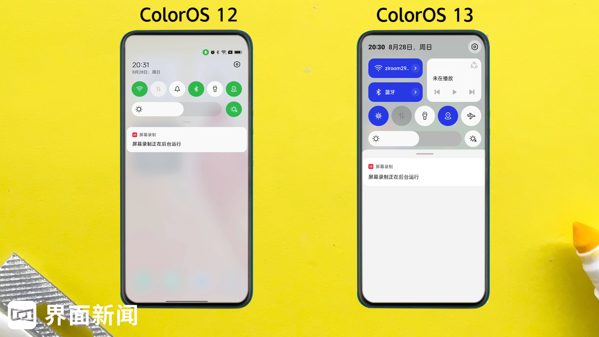 相比Coloros12,Coloros13也对“控制中心”进行了改版。在“控制中心”顶部,新系统提供了两个可自定义显示的横条区域,同其他控制按钮进行了区隔显示,这两个按钮也支持快捷操作,例如快速选择切换Wi-Fi,而同Coloros12一字排开的排版相比,新版“控制中心”层次感也更加分明。