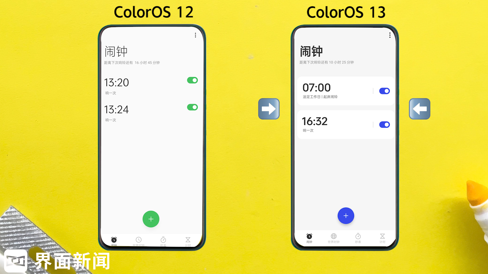 此外,Coloros13也加入了“卡片”元素。包括设置、闹钟在内的排版,都增加了卡片式的区隔度,以此显示不同的区域选项。