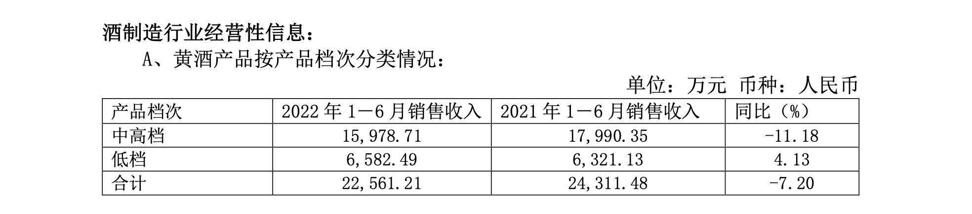 从产品层面来看,上半年,金枫酒业中高档、低档产品分别实现销售收入1.6亿元、0.66亿元,同比提升-11.18%、4.13%。