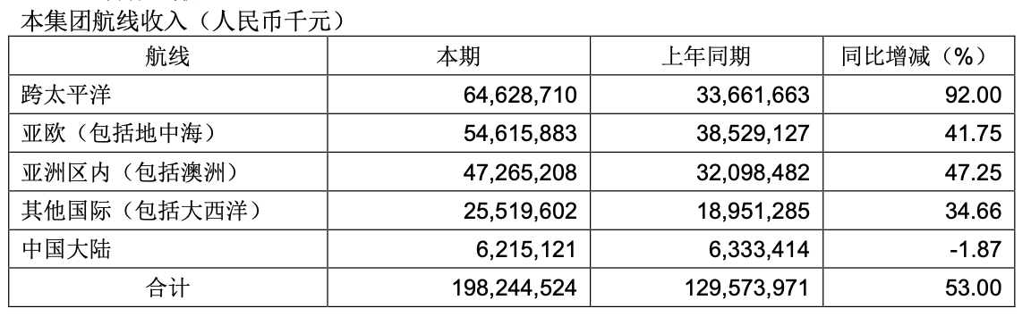 在这些集装箱航运业务中,跨太平洋航线收入最高,达646.29亿元,同比增长92%;其次为亚欧(包括地中海)航线收入为546.16亿元,同比增长41.75%。中国大陆航线收入为62.15亿元,同比下降1.87%。