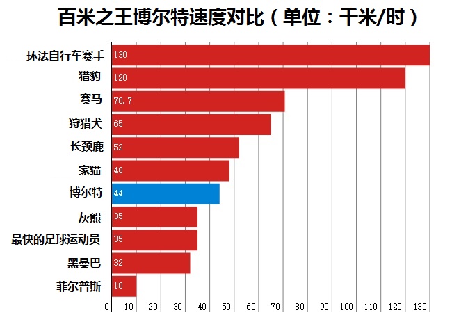 BBC援引的一份研究显示,业余跑者要完成百米冲刺需要50到55步,优秀的职业跑者往往需要45步,而博尔特由于腿长步幅大只需要41步。