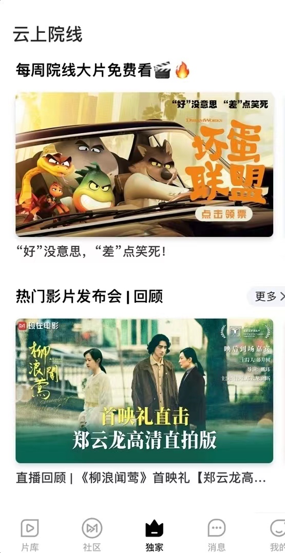 另外,还有一类多以独立形态存在,例如“现在电影”。值得一提的是,它是首个在国内打出不依赖会员体系而完全践行“单片付费+分账”模式的电影App,并且提供独家版权作品。