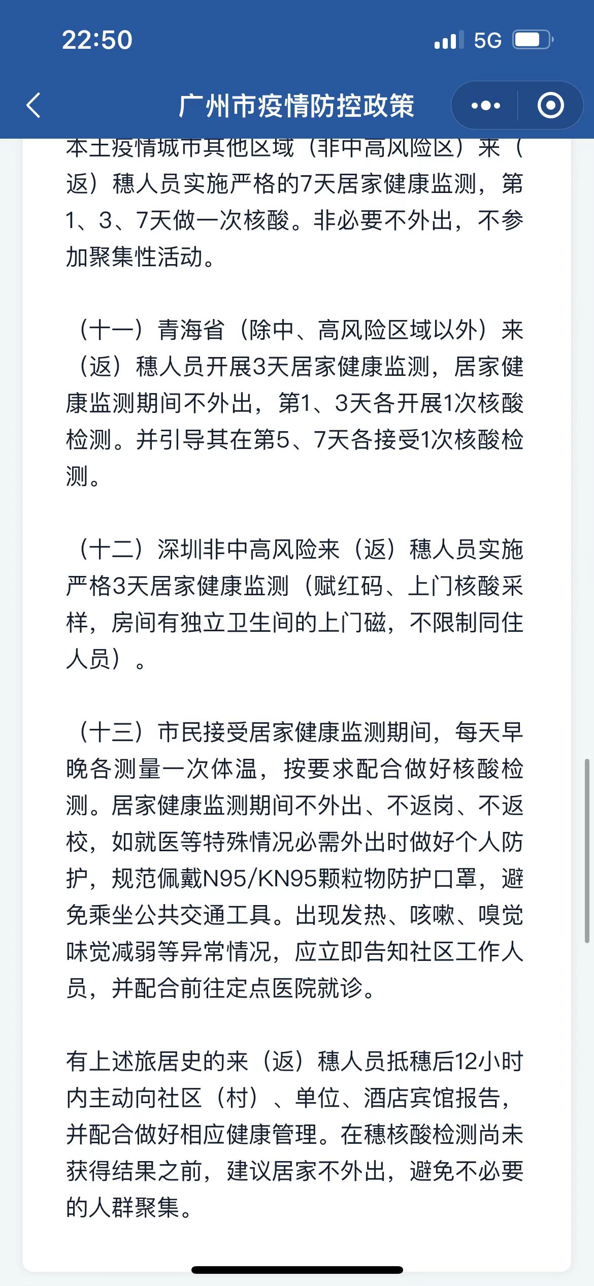 8月31日,“国务院客户端”小程序上的广州市疫情防控政策显示,深圳非中高风险地区来(返)穗人员实施严格3天居家健康监测(赋红码,上门核酸采样,房间有独立卫生间的上门磁,不限制同住人员)。