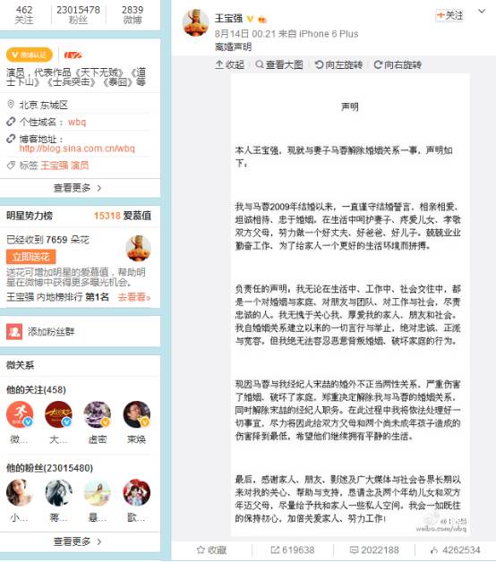 8月14日凌晨,一颗炸弹震醒了整个娱乐圈。王宝强在微博发布500字左右的离婚声明,短短半个小时留言超过20万,比奥运会金牌大战都牵动人心。王宝强离婚声明称“无法容忍恶意背叛婚姻、破坏家庭”。并在声明中指出:“马蓉与我经纪人宋喆的婚外不正当两性关系,严重伤害了婚姻、破坏了家庭,郑重决定解除我与马蓉的婚姻关系,同时解除宋喆的经纪人职务。”