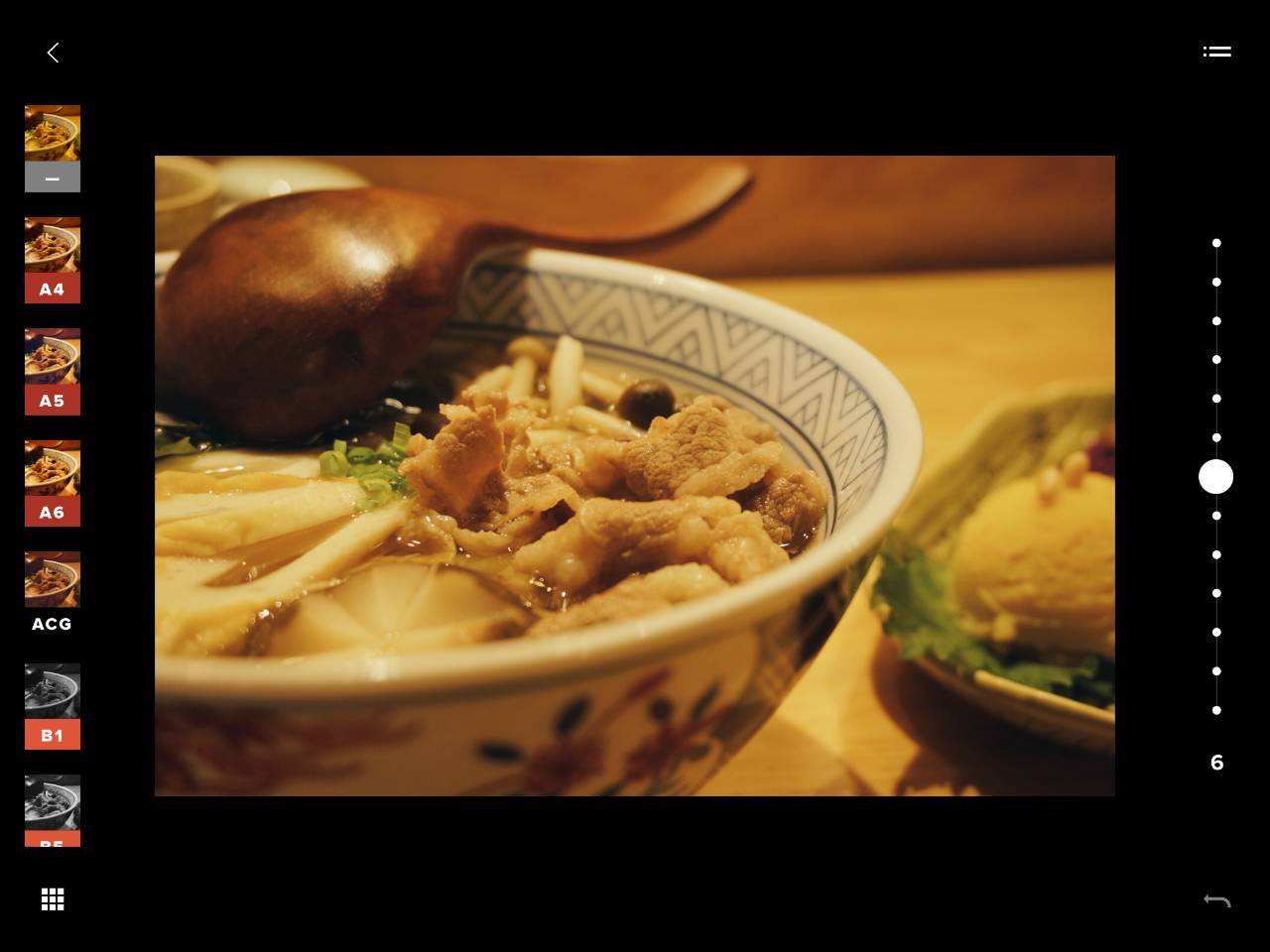 VSCO大概是文青必备的修图app了,固定的调色模板。建议用snapseed来调光,用vsco的滤镜调色。vsco的胶片效果其实不是完全适合食物的所以滤镜不要调到12那么高,一般6-8就够了。
