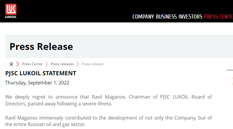 俄罗斯卢克石油公司9月1日发布声明称,公司董事会主席马加诺夫(Ravil Maganov)因重病去世。