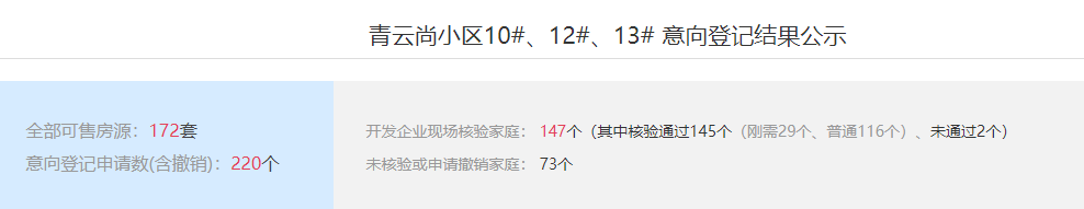 龙湖青云阙此次推售的是10#、12#、13#。其中,10#、13#是26层高的毛坯高层,2T3,户型面积约130㎡、188㎡;12#是10F的洋房,平层户型面积约220㎡,一层为213㎡、顶层为247.14㎡,一梯一户。可售房源172套,申请数220个,但通过核验家庭147个。