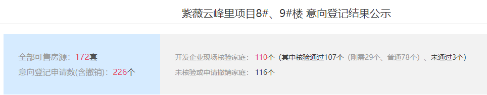 8月初,紫薇云峰里10#、13#楼的登记情况十分不错,但弃验家庭数占比约达三分之一。当前,紫薇云峰里8#、9#楼完成登记,105-143㎡的三室、四室,均价24333.79元/㎡,全部准售住房房源共172套,8#为26层高的毛坯高层,2T4,户型面积约105.4㎡、127.45㎡;9#为17层高的小高层,2T2,户型面积143.37㎡,意向登记226个,通过核验家庭数110个,弃验占比依然较高。社区未来还有9栋小高、高层待推售,其中11#楼为10F的小高,其余均为17F/26F楼栋。