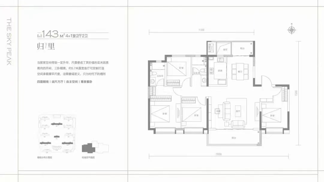 紫薇云峰里,同样采用改善标配的南北通透的大开间设计,置业顾问介绍其128㎡的三室户型为三开间朝南,南向采光面达到12.3米;143㎡的四室户型,三卧室+客厅四开间朝南,南向采光面有15米,且南北为双阳台设计,通透性极好。