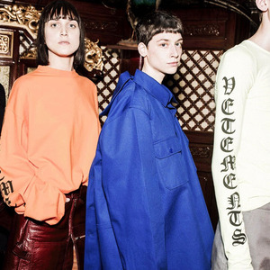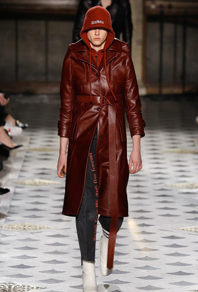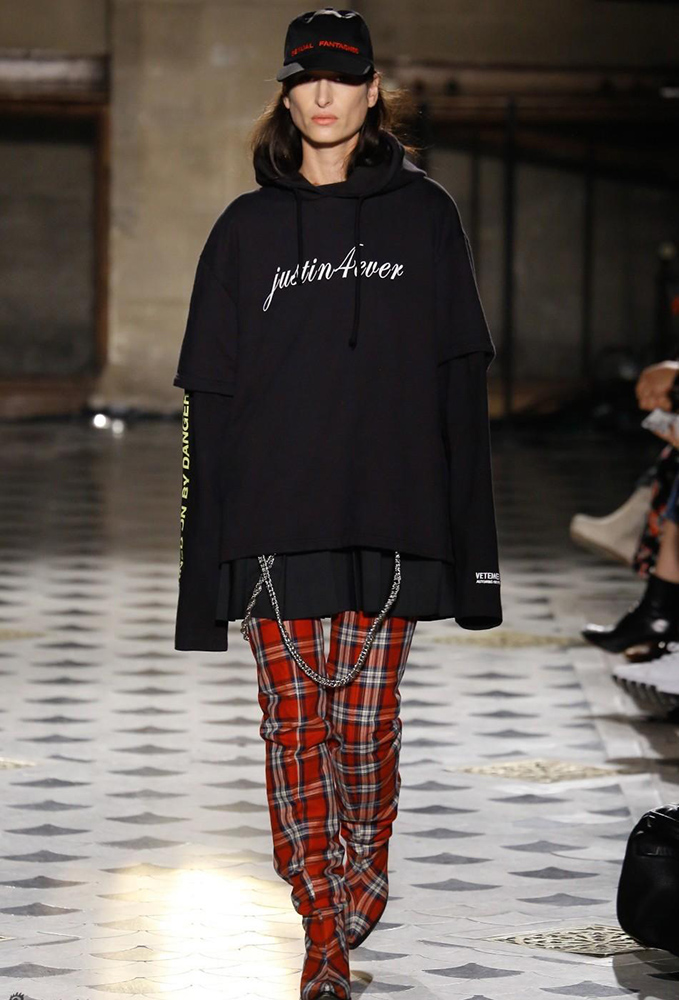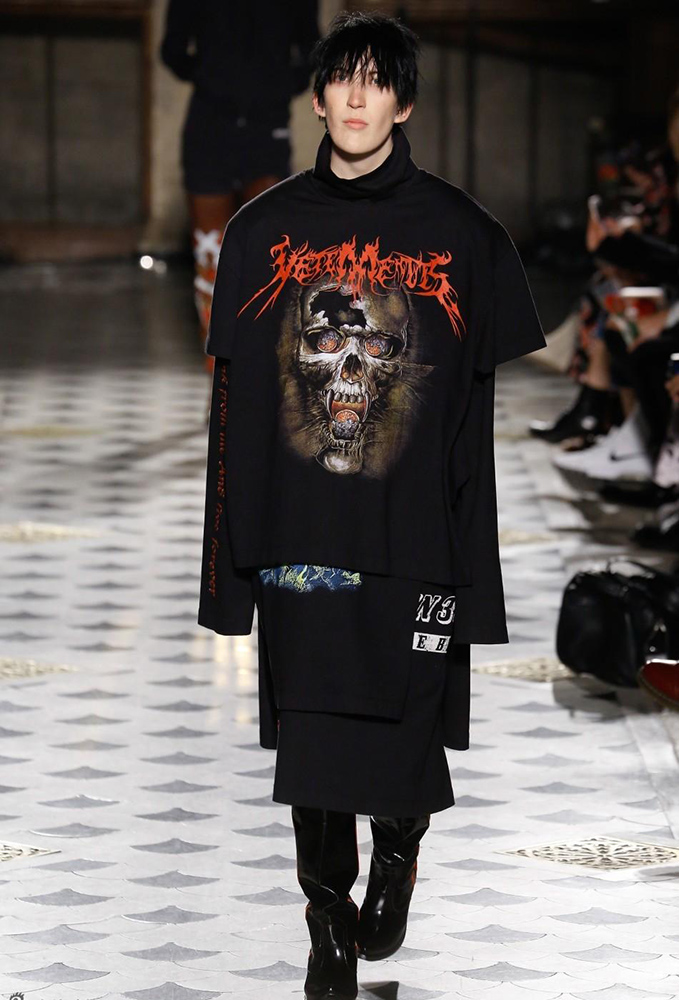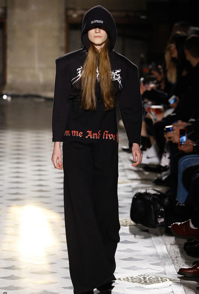 Vetements 2016秋冬系列的发布会上,哥特体被运用到极致,“drink from me and live forever”(也就是"吸吾之血,以致永生"的意思)的字样被印在了帽衫上,最刺激的还是这件拖地长裙,字样围绕在女性私密部位……