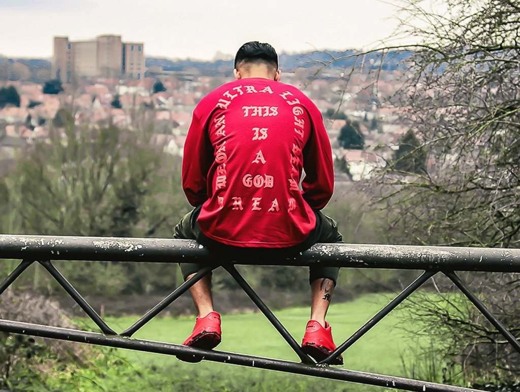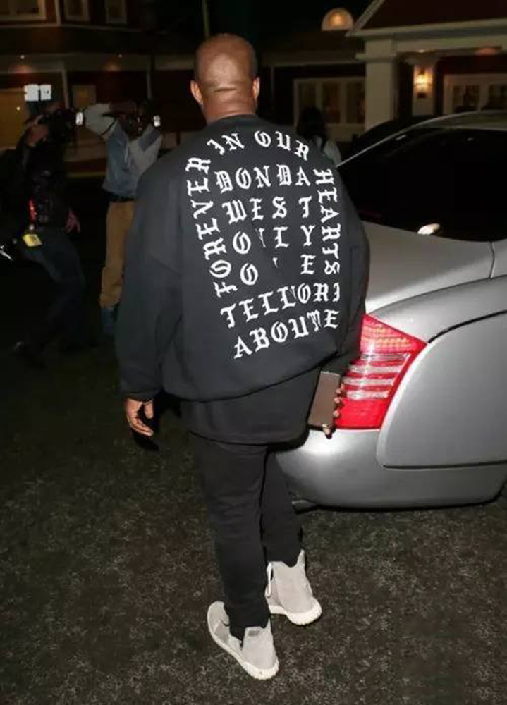 我们说的是Kanye 和艺术家 Cali Thornhill DeWitt 合作的T恤、连帽衫、帽子,发布会当天Kanye穿了一整套以作示范。我们可以看到,歌词被印刷在衣服上,而这个设计方式几乎清一色以哥特体印刷为主。
