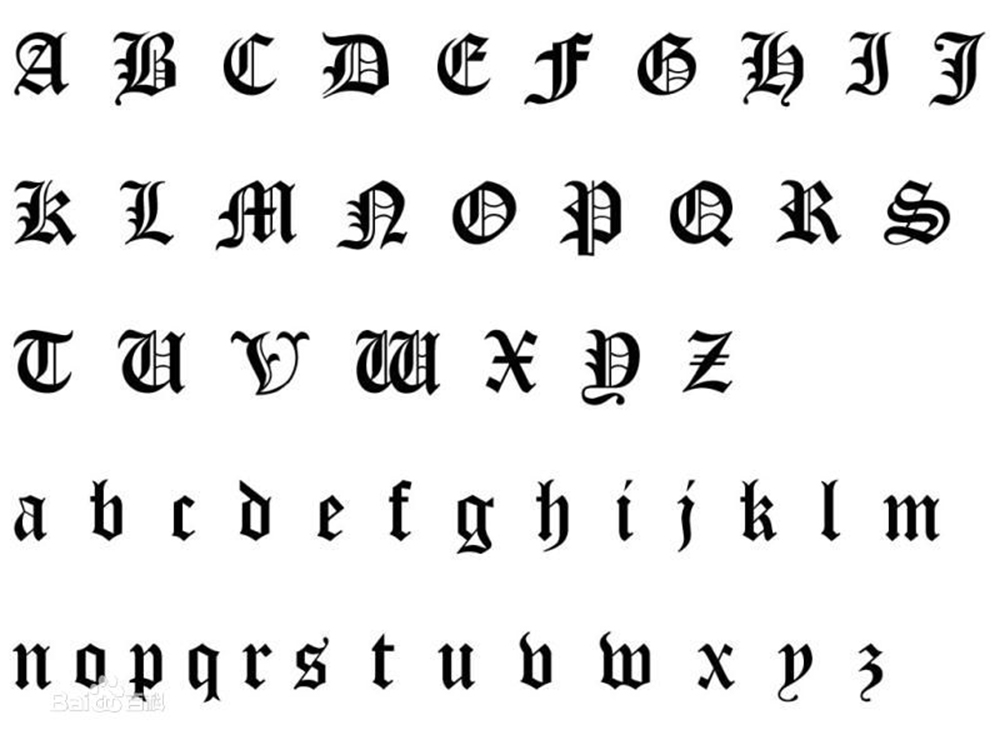 这种被称为哥特式的字母颇具美感却又难以辨认。竖线较粗,且有装饰性很强的缀线,被认为是最难书写的字体之一——也许就是哥特字体的魅力所在。