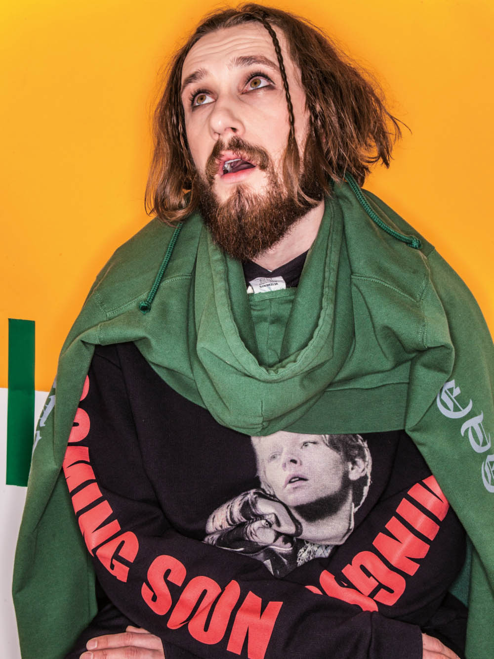 还有一个令哥特体焕发新生的艺术家,是生活在洛杉矶的Cali Thornhill Dewitt。我们前面有提到,他也是 Kanye West 的新专辑及周边“Life of Pablo”系列的背后功臣。并与德国柏林的《032c》杂志合作,共同制作了一件联名产品。