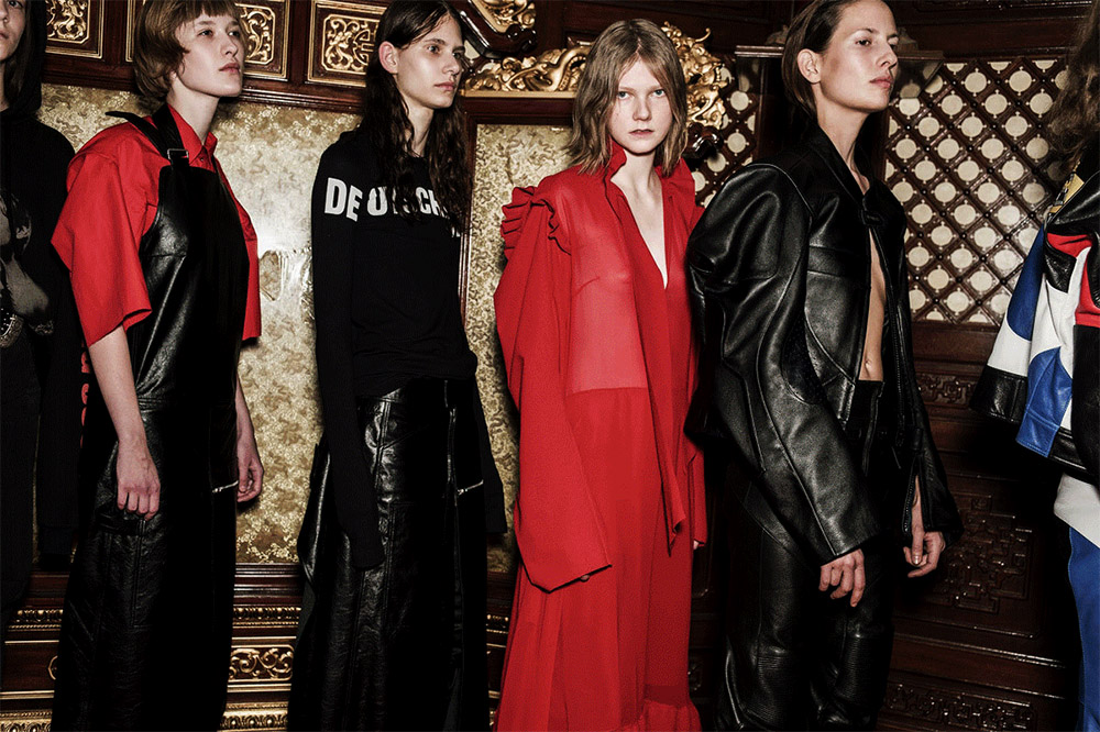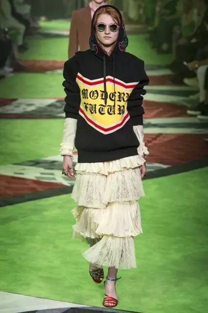 另一方面,设计师们也以越来越放松的姿态,将哥特体融入服装中,例如将宣传语或是简单的字眼以哥特字体的样式印刷在袖子上,让人们更为容易接受。