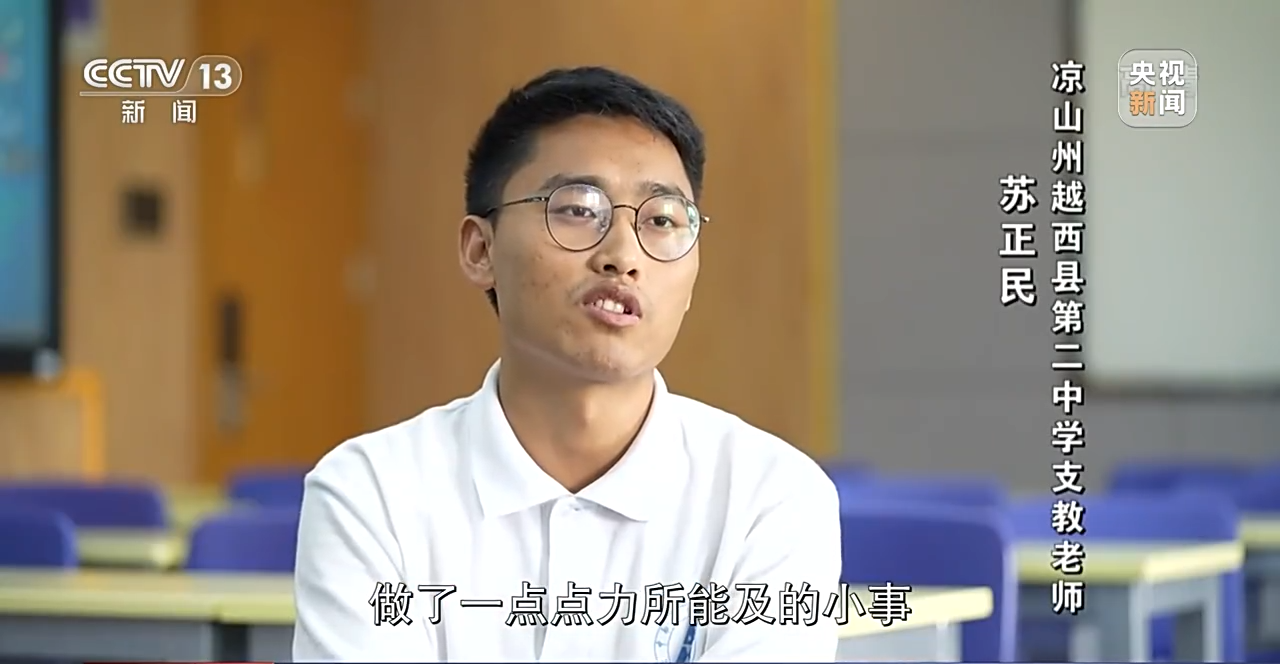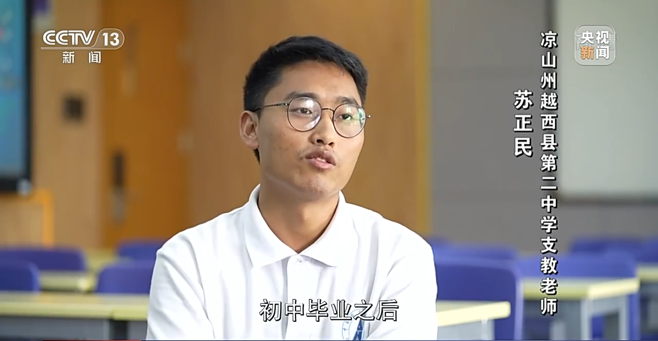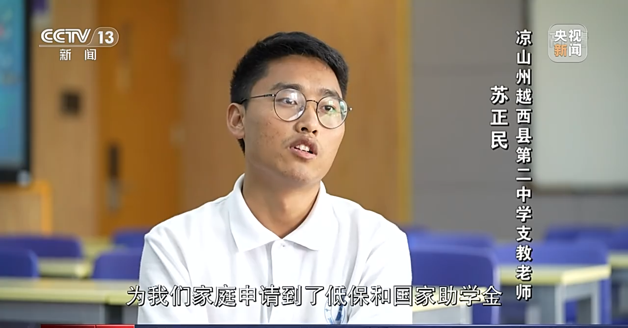 凉山州越西县第二中学支教老师 苏正民:村里面的支书和学校的老师一直联系我,让我回去读书,为我们家庭申请到了低保和国家助学金,还为我找到了社会上的资助。重新回到学校之后,在此之前我从来没有(像这样)意识到爸爸经常跟我说的“农村的孩子一定要努力读书,只有读书才能更好改变你们的命运”。