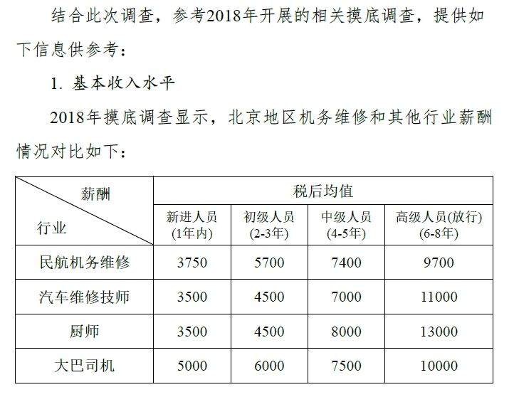 据2018年摸底调查情况,北京地区机务维修和其他行业薪酬相比,资深机务的工资甚至比不上同样资历的大巴司机、汽车维修技师、厨师等。但是对学历、培训、英语水平等要求远非维修汽车可比,而且面临巨大的安全责任和压力。